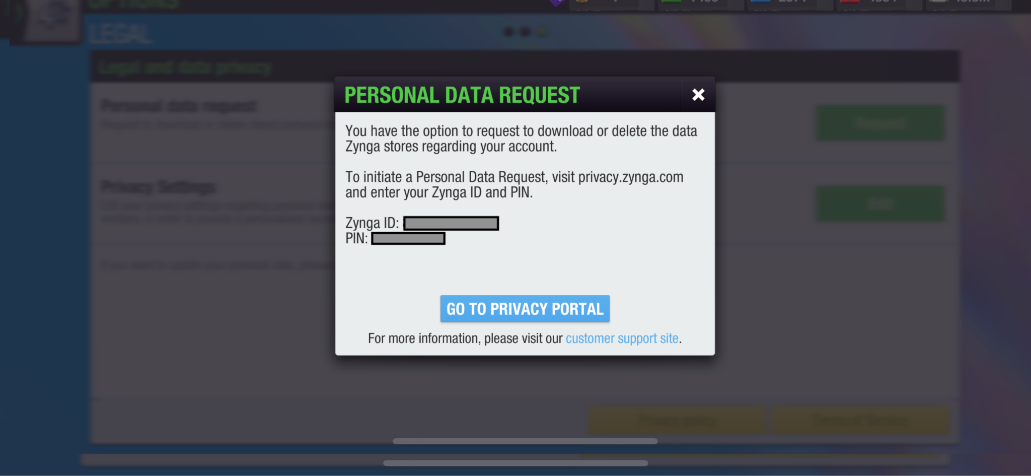 You can use Zynga's personal Data Request Portal to make a request to download or to delete your game account data.